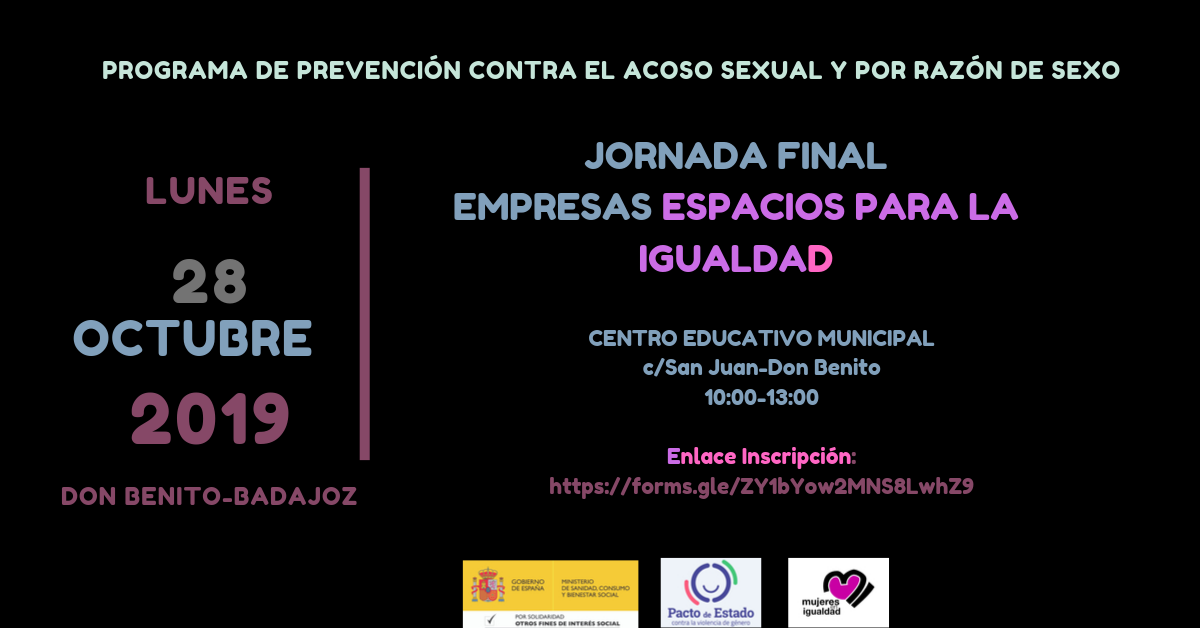 El próximo lunes 28 de octubre, Mujeres en Igualdad celebrará en Don Benito (Badajoz) la jornada de clausura de nuestro programa de prevención del acoso sexual y por razón de sexo en las organizaciones laborales.